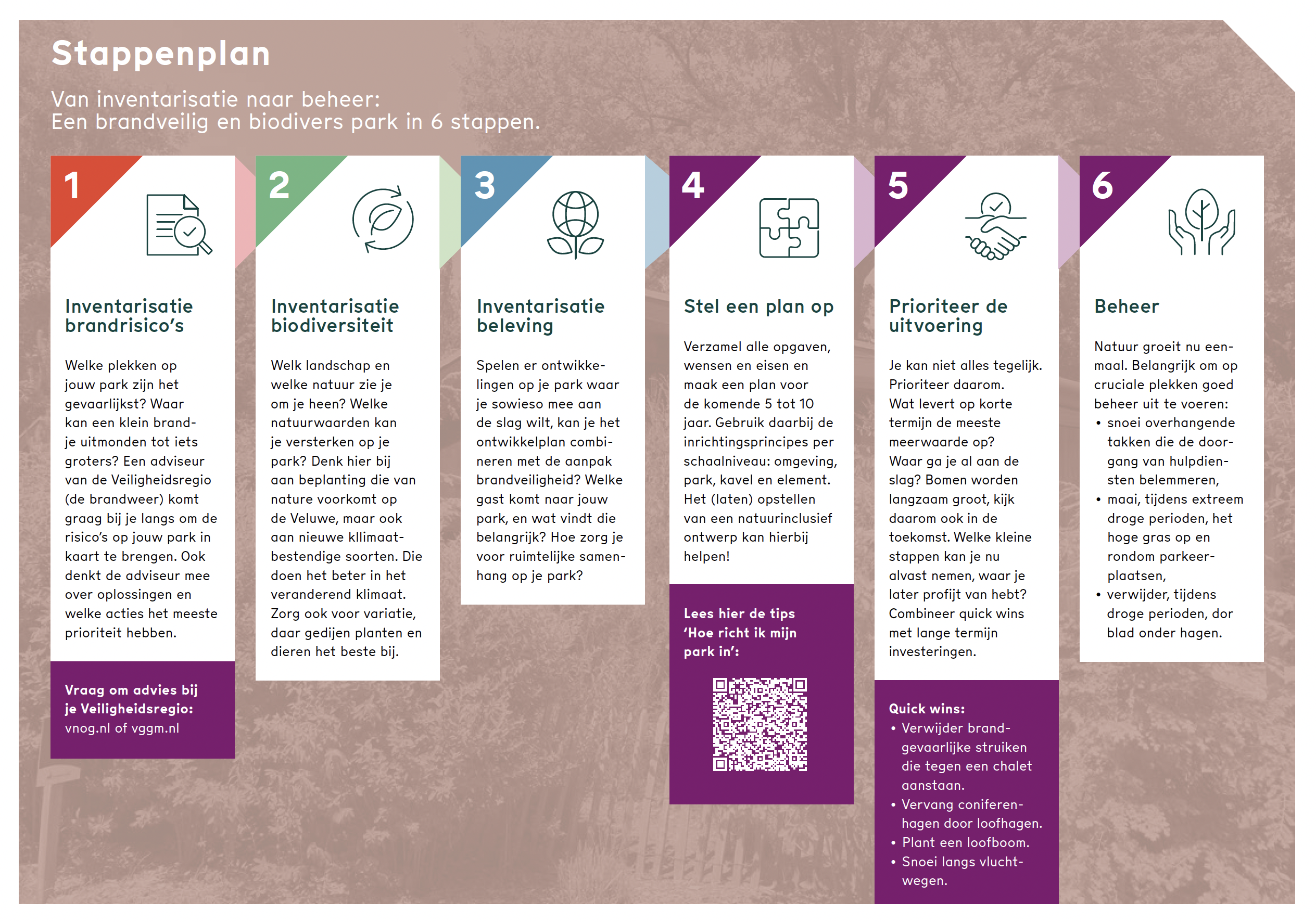 Adviezen, tips en voorbeelden in de publicatie Brandveiligheid en biodiversiteit: Hoe richt ik mijn park slim in? laten zien hoe je hier zelf stapsgewijs mee aan de slag kunt gaan.